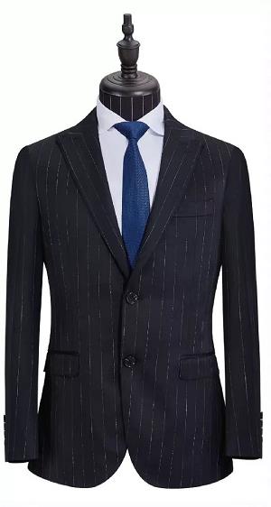 此款男士休閑定制西裝采用半麻襯工藝,為黑色條紋款,黑色西裝是男士經典流傳的款式,但是休閑西裝定制款把版型設計得更加寬松修身,減少了正式感,尤其適合年輕的男士!